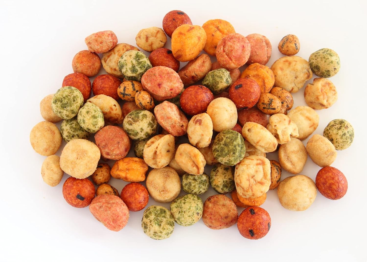 材料:花生、小麥粉、坎白粉混合物(澱粉、糯米)、糖、食用植物油、澱粉、青豆、醬油、豬肉調味料、蝦、鹽、澱粉糖漿、香料、魷魚、魚子加工品、扇貝調味料、葡萄糖、海藻、海苔、牛肉調味料、醬油粉、蛋白質水解物、醃薑、味噌粉、鰹魚片粉、酵母萃取物/調味料(胺基酸等)、膨鬆劑、增稠劑(加工澱粉)、磷酸鈣、調味料、色素(黃5、紅102、藍2、類胡蘿蔔素、紅麥芽)、酸化劑(部分花生、小麥、牛奶原料、魷魚、蝦、大豆、雞肉、豬肉、牛肉、明膠)